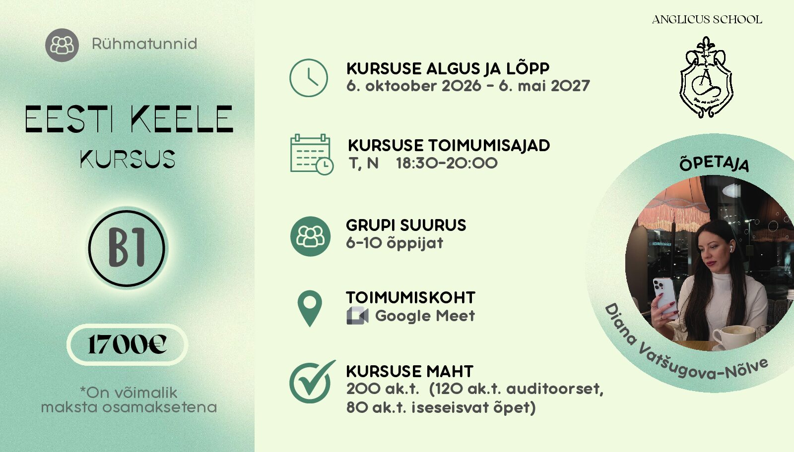 Kursuse nimi: Eesti keele kursus B1 Kursuse maht: 200 ak.t. (120 ak.t….